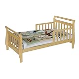 The Sleigh Toddler Bed by Da Vinci is the perfect bed for your little one who has outgrown the crib, but is not ready for a full bed. The guard rails provide safety against falls, so you, and your toddler, can sleep better. This bed is the perfect transition towards sleeping in a full bed. Proper first transition from the crib before moving to a twin or full size bed. Features:Uses the same standard crib size mattress that you used on your crib.Sleigh style unisex toddler bed with guard rails on both sides for added security.Constructed of solid pine wood and wood composites.Maximum Weight Capacity is 50lbs.1 Year WarrantyFinish: Natural